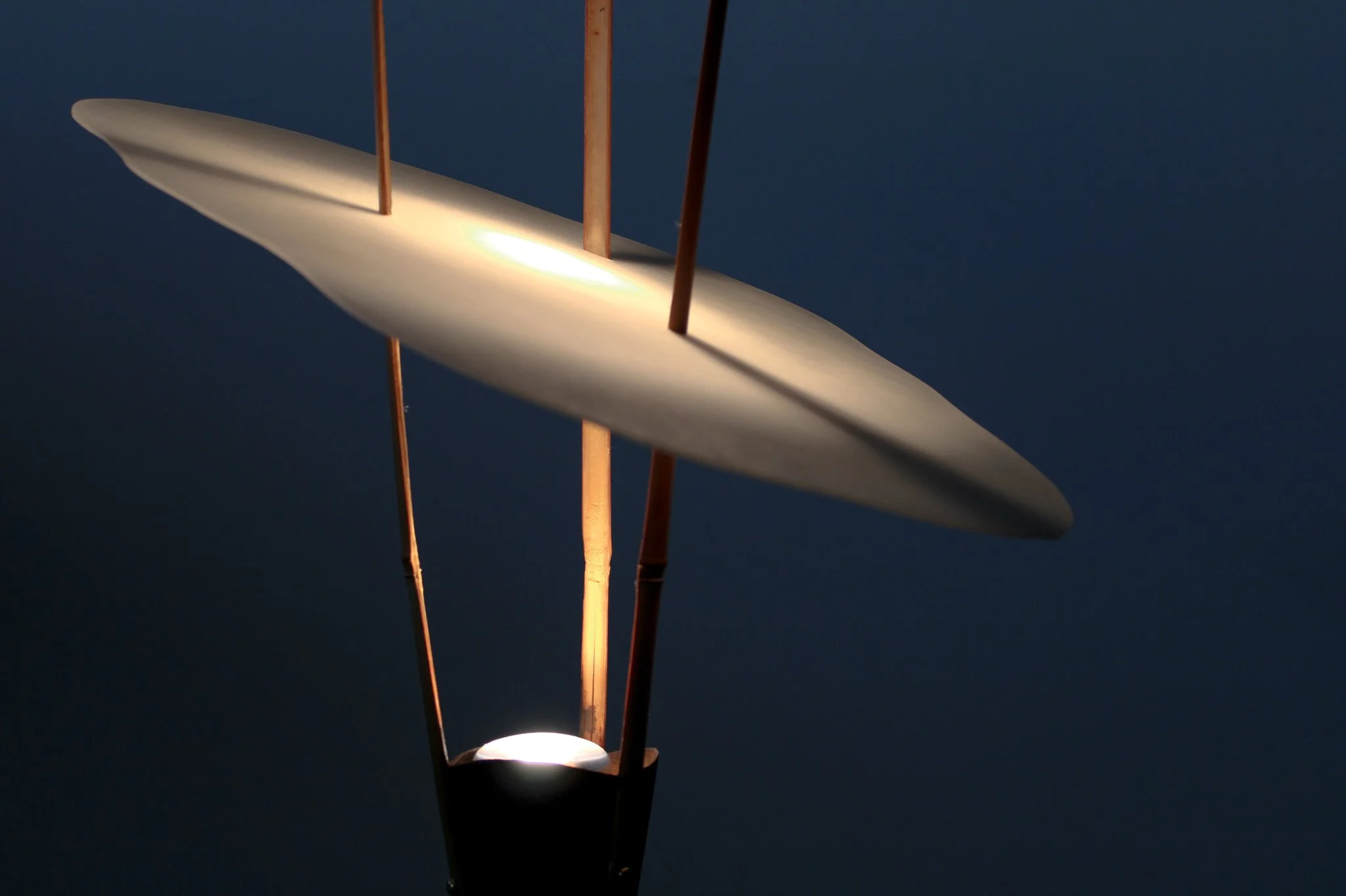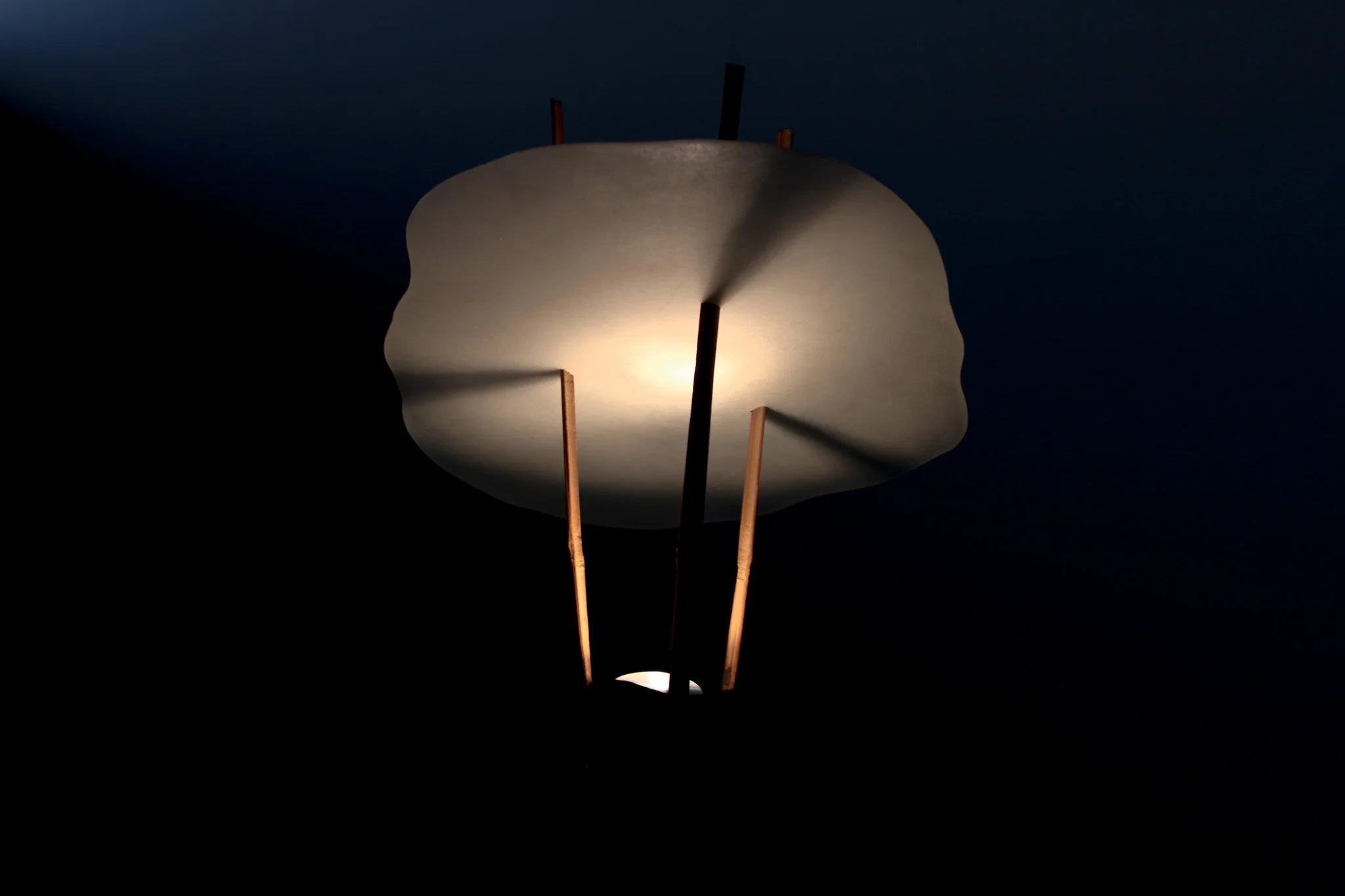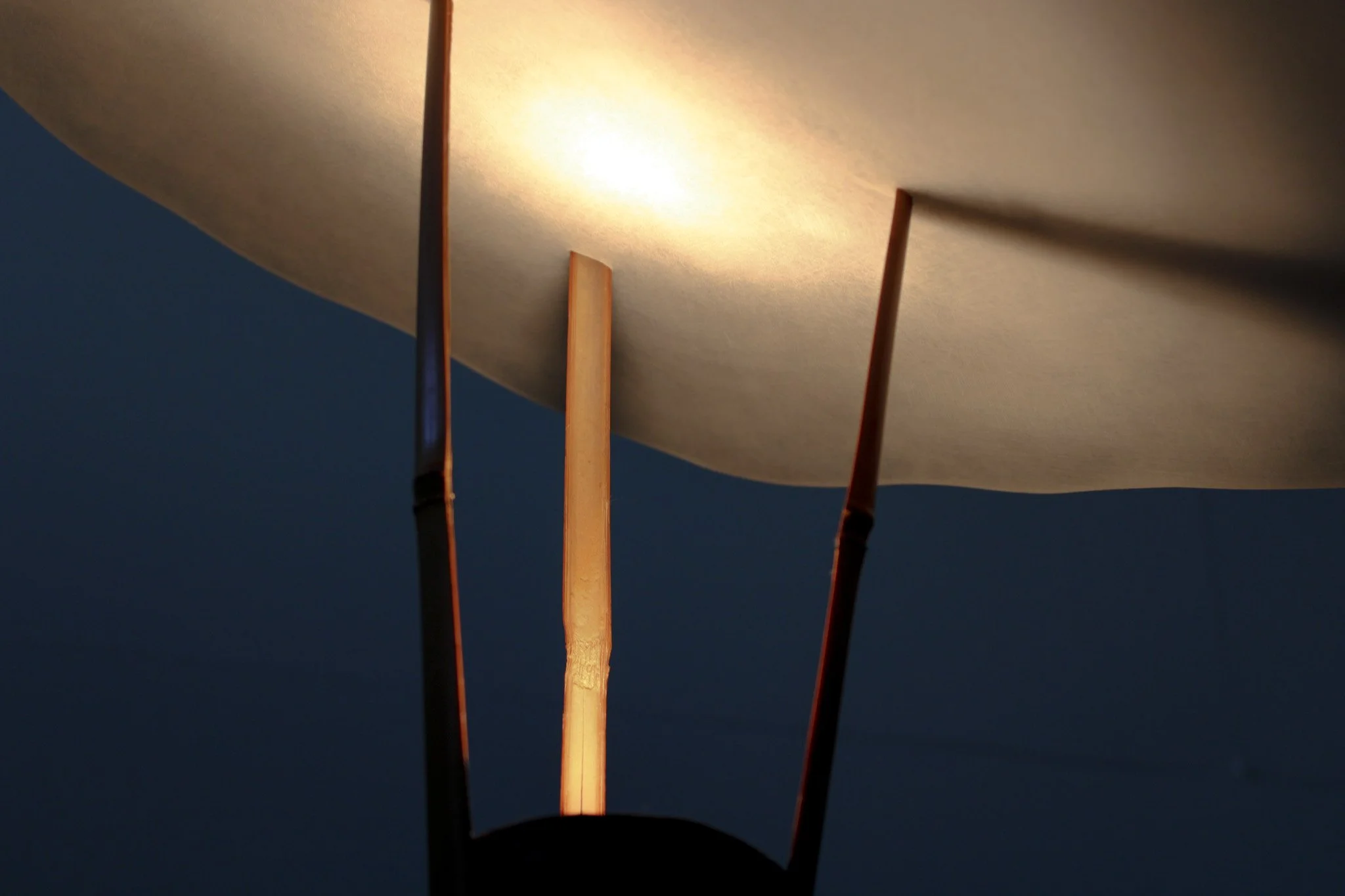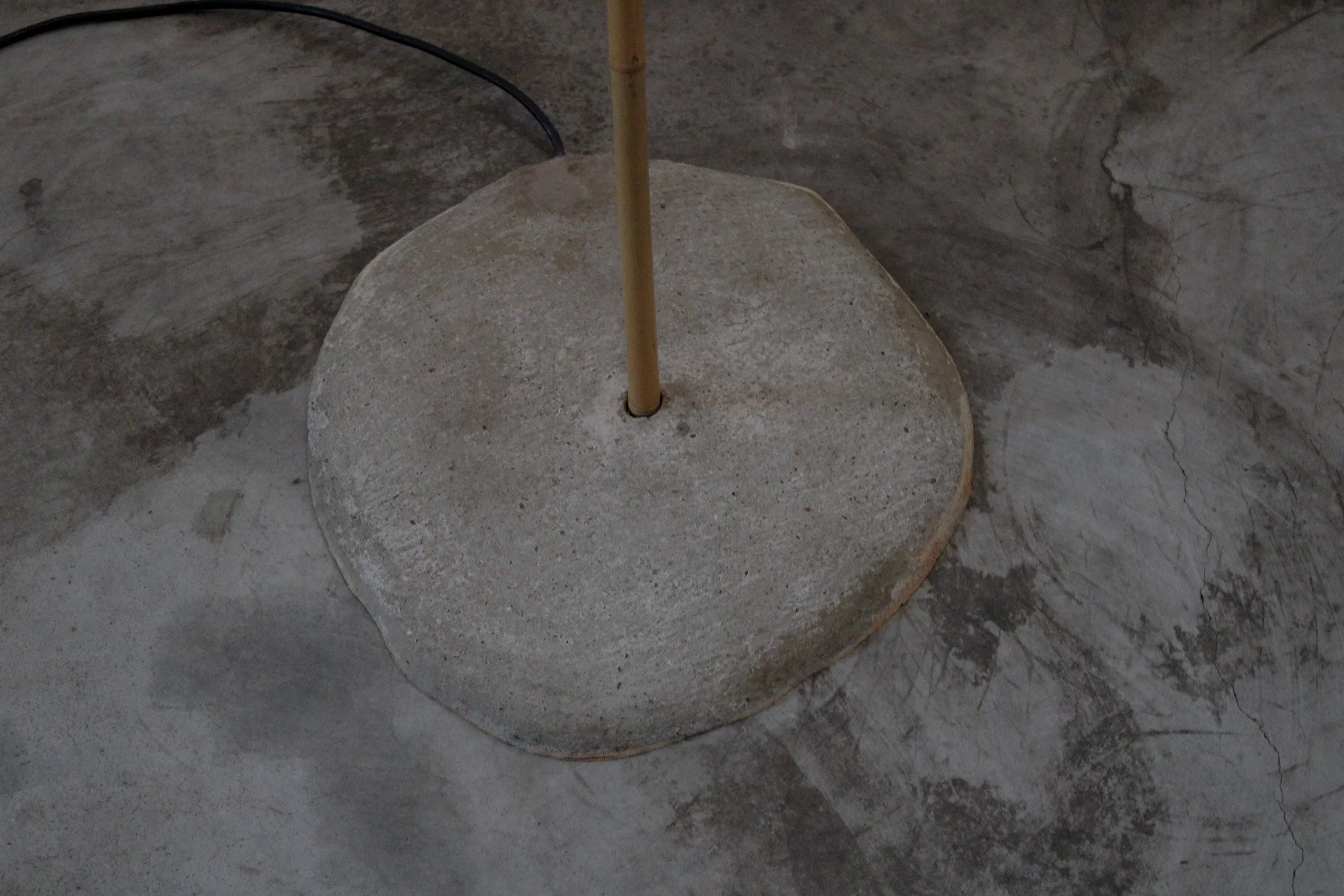 This lamp is made out of a concrete base which holds bamboo going up to a metal lamp cone. The ´shade´ is made out of a thick high quality plastic.